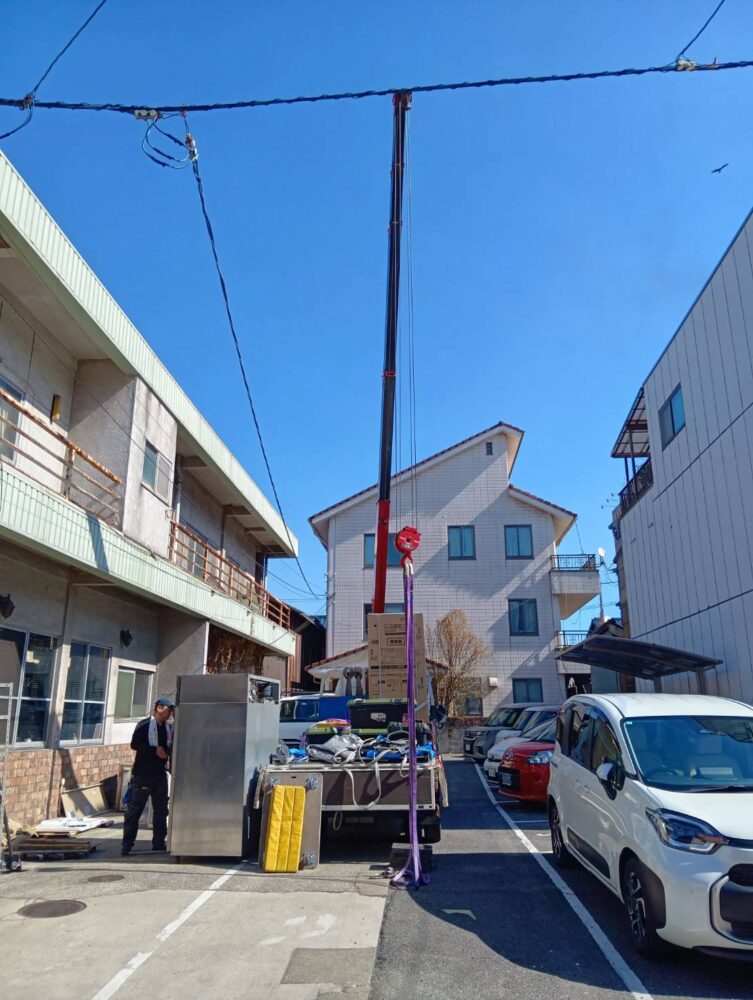 駐車場のど真ん中にクレーン機能付きの大型トラックを据え、足場を固め、クレーンで新しい冷凍冷蔵庫を降ろし、古いものを積み込む。1時間半ほどで完了したが、改めて見ると、なかなかに大がかりな作業である。